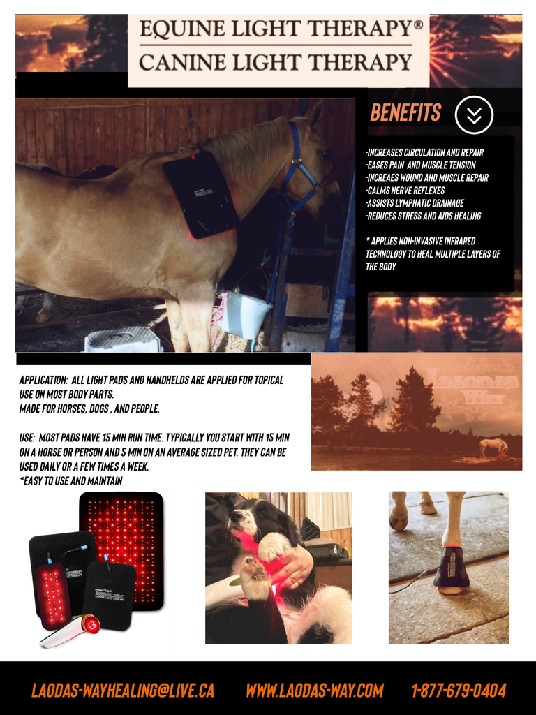 Equine & Canine Light Therapy pads have become a "must have" for many animal owners. Why? They are safe, easy to use, affordable and effective. Since the early '80s, light therapy (sometimes called red light therapy, Phototherapy, LED therapy, DPL, Infrared therapy, Photon Therapy, or Red/Infrared Therapy) has been used in the horse world for treating equine concerns and helping owners and trainers keep their horses in top shape. The first light therapy that was widely used on animals was laser therapy, also called low level laser therapy (LLLT) or cold laser therapy. It has since been reported that light therapy using LEDs produces many of the same benefits as LLLT, but is less costly and much safer. A 1989 study entitled "Low-Energy Laser Therapy: Controversies and New Research Findings", Jeffrey R. Basford, M.D. of the Mayo Clinic’s Department of Physical Medicine and Rehabilitation suggests that the coherent aspect of laser may not be the source of its therapeutic effect. Thus any effects produced by low-energy lasers may be due to the effects of light in general and not to the unique properties of lasers.* LEDs do not deliver enough power to damage the tissue, but they do deliver enough energy to stimulate a response from the body to heal itself. LEDs provide a much gentler delivery of the same healing wavelengths of light as does the laser.